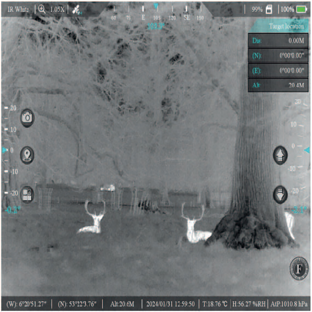 - 弹道解算功能可基于内部存储的给定射表(支持客户自行导入)、本机检测到的环境参数(包括温度/湿度/气压,目标距离、俯仰角度等)和手动输入的风速风向(包括横风、纵风等)进行快速弹道解算并输出射角、风偏角并在图像上进行标注射击点,以辅助射手的快速精准打击。